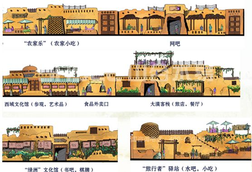 以“樓蘭魂”、“心靈驛站”、“天人合一”為文化氛圍的核心,打造豐富多彩的本土商業(yè)體系鏈。引入商業(yè)成為改造后街區(qū)主要贏利點(diǎn),只有贏利才能維持街區(qū)運(yùn)營(yíng)因此特別重要。主要可考慮茶吧、水吧、書(shū)吧、棋牌吧、酒吧、網(wǎng)吧、藝術(shù)品銷(xiāo)售、紀(jì)念品銷(xiāo)售等。