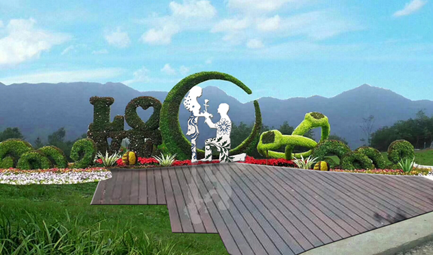 2.2生態(tài)婚戒:這是一個(gè)婚戒造型的仿真綠雕。生態(tài)婚戒前再設(shè)置一個(gè)剪影式縷空雕塑,以此形成引導(dǎo)式體驗(yàn)效果。