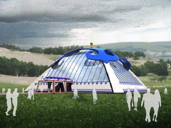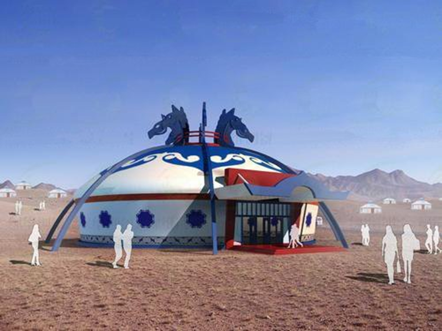 我們把蒙古族文化符號(hào)融入現(xiàn)代建筑中,使之具備休閑酒店功能。這種蒙古包式酒店采用現(xiàn)代建筑材,屋頂和雨棚等地方則運(yùn)用了蒙古族圖騰圖案。整體色調(diào)采用藍(lán)白紅三色,從而與草原的藍(lán)天白云意境相襯托。