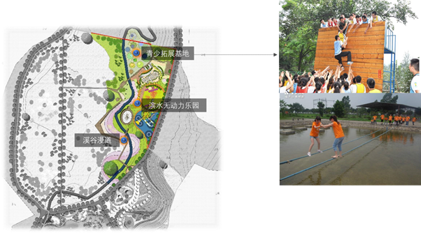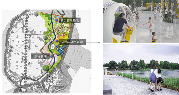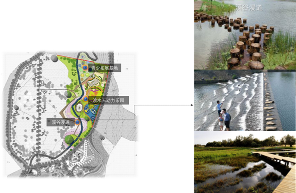本區(qū)主要項(xiàng)目含溪谷漫道、濱水無(wú)動(dòng)力樂(lè)園、青少素質(zhì)拓展基地等。功能上兼顧游親水景觀(guān)、親子娛樂(lè)、修學(xué)拓展。