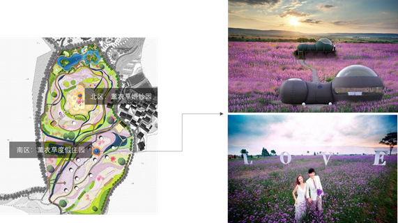 (2) 南區(qū)薰衣草度假莊園:偏度假功能。創(chuàng)意薰衣草“花海氣泡屋”為主要特色;同時(shí)也兼具北區(qū)的觀(guān)光攝影功能。