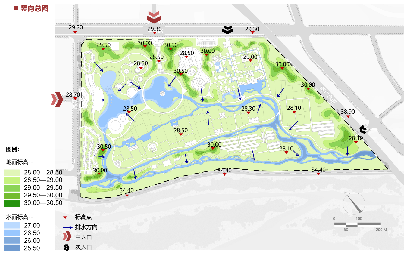 場地需要滿足部分行洪功能,規(guī)劃設(shè)置兩處水閘,以保證園區(qū)內(nèi)水體安全。現(xiàn)狀場地內(nèi)水體面積約為3.8公頃,設(shè)計(jì)后的總體水體面積約為9.0公頃。北部設(shè)計(jì)為中心景觀水體;南部為濕地水體。通過雨水花園的規(guī)劃,收集場地雨水,補(bǔ)給公園用水。