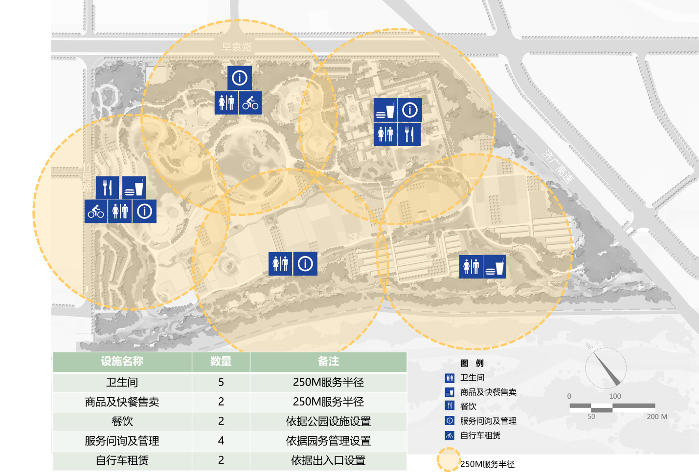 衛(wèi)生間、簡易售賣點(diǎn)按照250米服務(wù)半徑合理設(shè)置。其它服務(wù)設(shè)施根據(jù)交通線節(jié)點(diǎn)酌情布置。