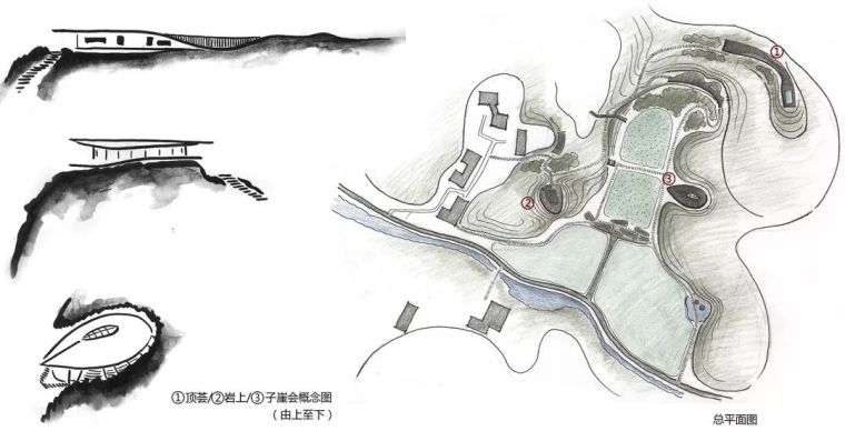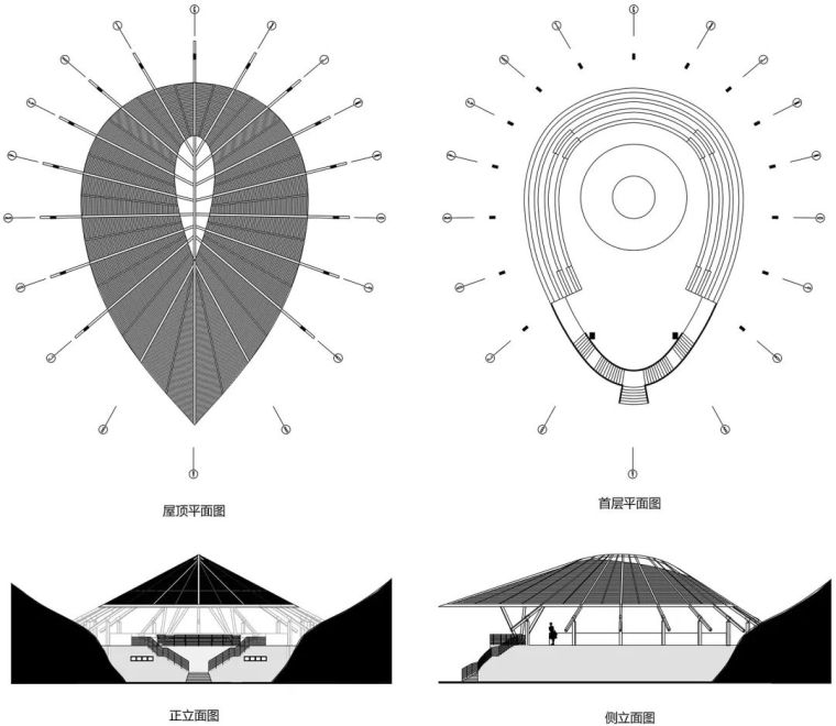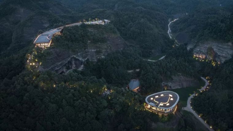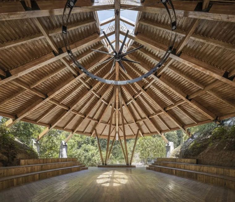 3、子崖會是組團(tuán)內(nèi)的一個(gè)公共活動場所,滿足婚慶儀式、小型表演、篝火晚會等活動需求。這個(gè)桃核形的建筑處在一個(gè)內(nèi)凹的小山谷中,其形的生成也是順其山勢:外輪廓幾乎遮蔽了整個(gè)山谷,只露出高高挑出的尖角。近乎圓形的中庭中央作為舞臺,周圍隨山勢設(shè)置了座椅,頂部的天窗提供了自然采光和通風(fēng)。