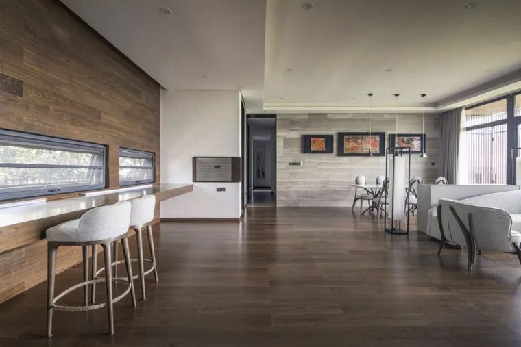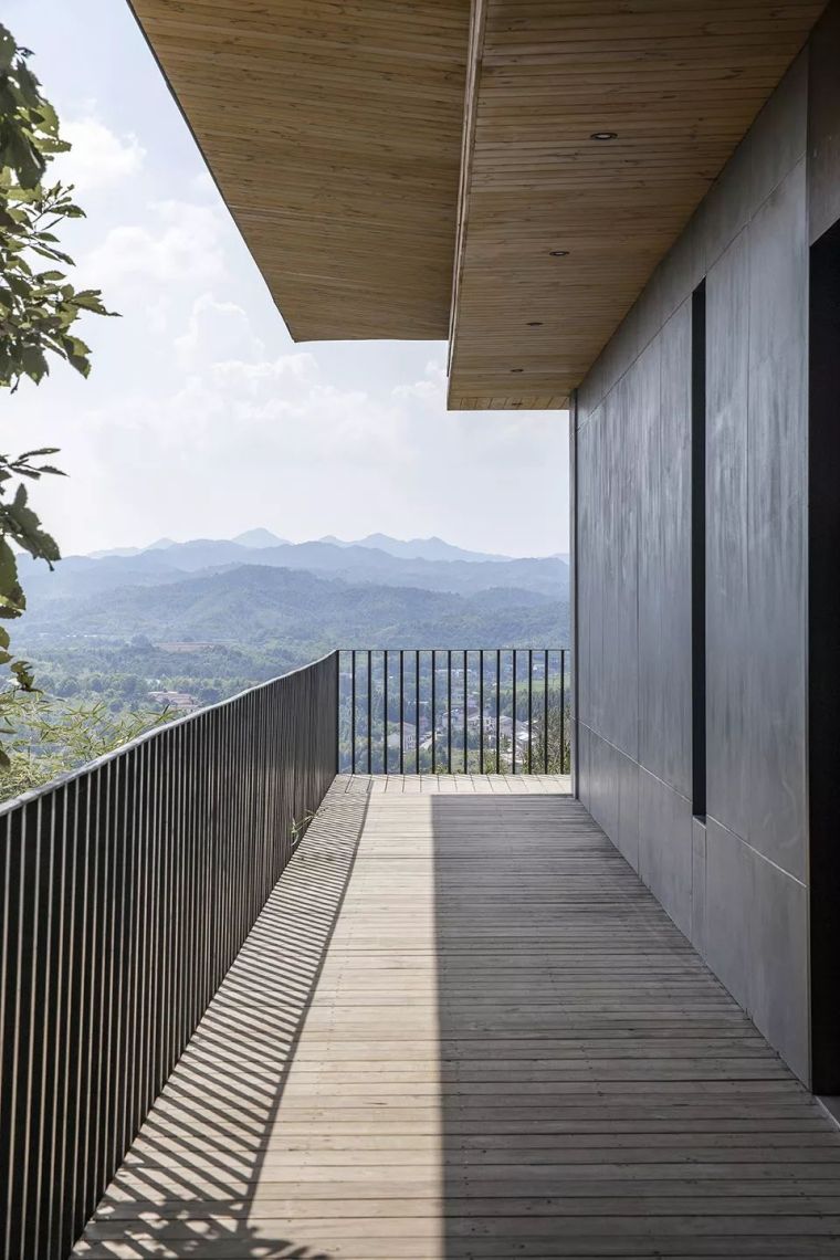 根據(jù)這一結(jié)構(gòu)關(guān)系,頂薈的內(nèi)部東側(cè)設(shè)置了四間客房,中間為SPA、更衣間、茶室等輔助功能,西側(cè)為無邊際露天泳池,總體形成一個(gè)單純的“一字形”布局。建筑的南北兩側(cè)都做了2.8米的屋檐挑出,南側(cè)遮陽,同時(shí)兼為露臺;北側(cè)為主要戶外通道,提供遮雨的頂棚。這樣內(nèi)嵌的立面為建筑的墻面增加了陰影,也使建筑的體量簡化為屋檐和底板兩條修長的線條。