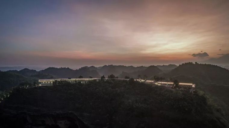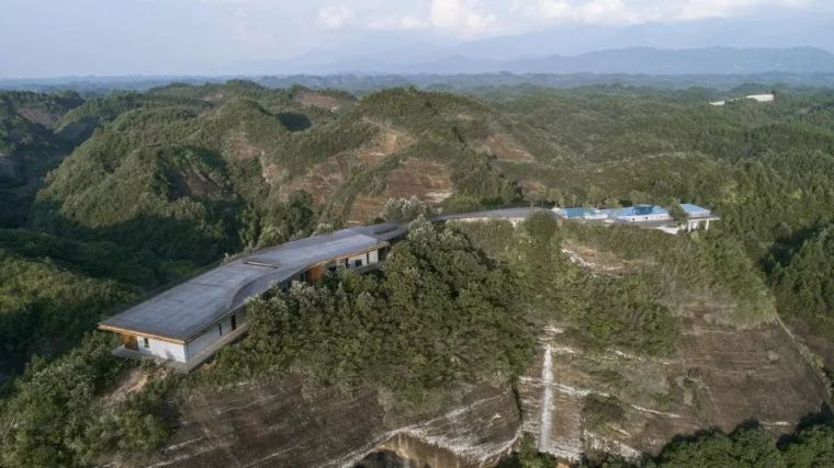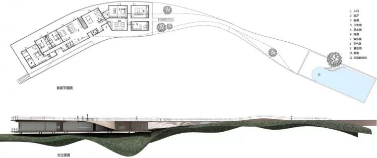 1、就場地邊界而言,頂薈位于山頂?shù)囊粭l狹長地塊上,主體建筑東西向長約45米,建筑東側(cè)至西側(cè)無邊際泳池總長122米,場地兩端高差約4.8米。在這個(gè)狹長的、自由邊界的場地,讓人深覺任何的“凸起”都是對山脊線的一種破壞。