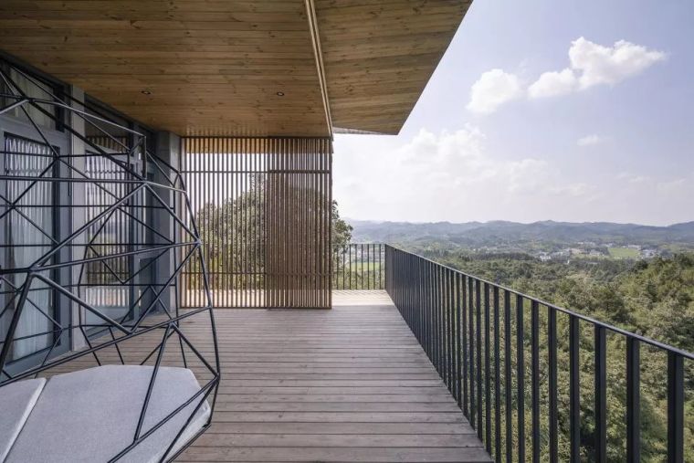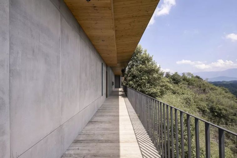 于是,最終的設(shè)計(jì)方案是在山脊的高點(diǎn)確定一個(gè)水平的平面作為屋頂,讓建筑體量向下生長,以填充地形落差的空間。如此一來,以消弱建筑在高度上的變化,轉(zhuǎn)而強(qiáng)調(diào)體量在水平方向的延展。在這一體量界定的空間內(nèi)部,再根據(jù)人的游走動線,以觀景的需要來設(shè)置房間與通道:一條略有曲折的動線連接各個(gè)客房以及西側(cè)的泳池。