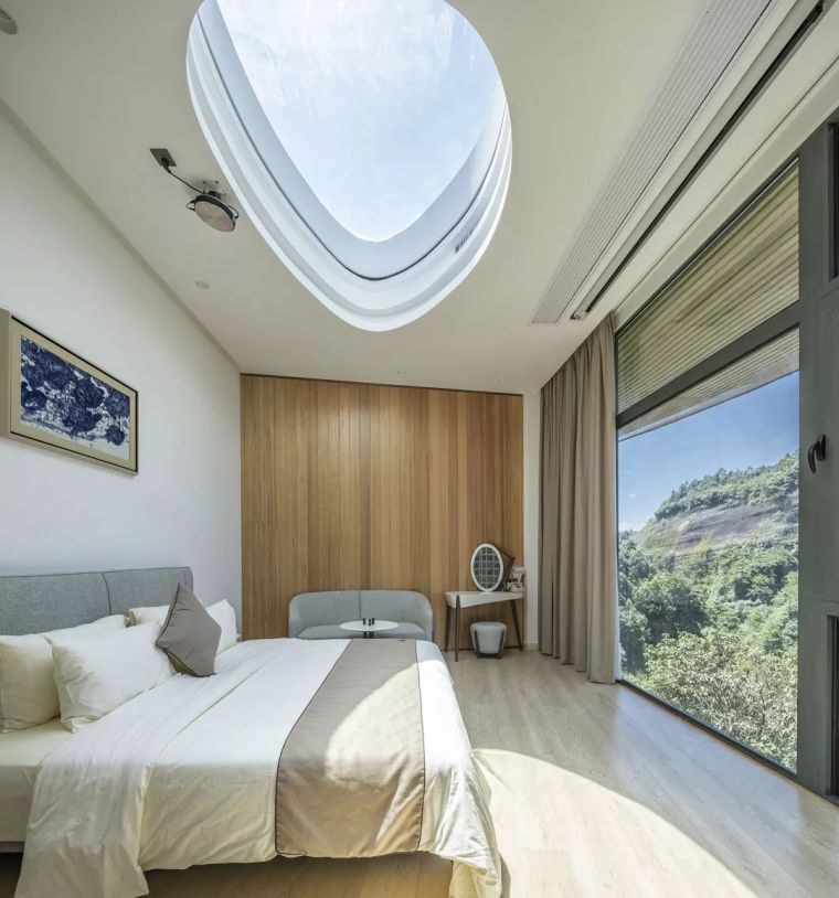 進(jìn)入房間后,空間豁然打開,C型曲線的平面配合圓床的設(shè)置,使得每個(gè)房間都具有不同的空間細(xì)節(jié)感受。屋頂?shù)臏\水池和水池底部的天窗為室內(nèi)空間點(diǎn)綴了一些巧妙的趣味;落地大玻璃將自然借景入室,屋頂水波紋的光影投射,也為空間增添一份獨(dú)特的體驗(yàn)。在客房下部,隨著山勢的降低,設(shè)置了一個(gè)環(huán)狀的觀景平臺;一個(gè)很小的早餐廳則嵌入在觀景平臺靠山體的一側(cè)。在這里,空間的設(shè)計(jì)并沒有太多著力的痕跡,一切都隨著自然的巖石形態(tài)慢慢展開。