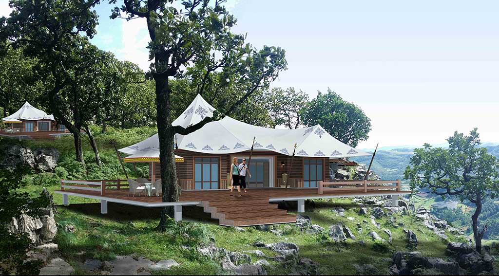 由一個(gè)或多個(gè)模塊組建構(gòu)成,用戶可根據(jù)自己的需要決定配置的功能模塊和設(shè)備組建。這種結(jié)構(gòu)便于以后的維修,拆卸和功能調(diào)整。已經(jīng)搭建好的帳篷客房也可根據(jù)需要拆卸、移動(dòng)、安裝;隨時(shí)更新模塊組建改變主題;使用過的帳篷客房可回收更新后再利用到其他項(xiàng)目中。集成化帳篷客房安裝供電供水設(shè)備后,可單體使用也可多個(gè)客房組合使用,更可以組合成中、大型客房集群,具備餐飲、休閑等生活性服務(wù)功能。其“設(shè)施平臺(tái)+功能模塊”的結(jié)構(gòu),使上層建筑(帳篷、整體衛(wèi)生間)造型比較靈活,地域文化的融入度高,若根據(jù)景區(qū)或整體景觀設(shè)計(jì),植入主題或文化元素,將達(dá)到更好的景觀效果。