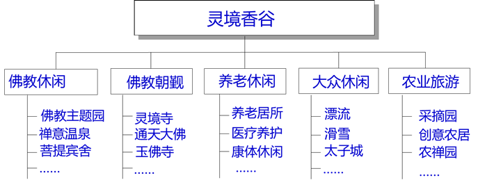 以“佛教休閑”為核心,涵蓋與聯(lián)動(dòng)“農(nóng)業(yè)開(kāi)發(fā)”、“傳統(tǒng)佛教朝覲祈福”、“一般性觀光游樂(lè)”、“養(yǎng)老產(chǎn)業(yè)”。