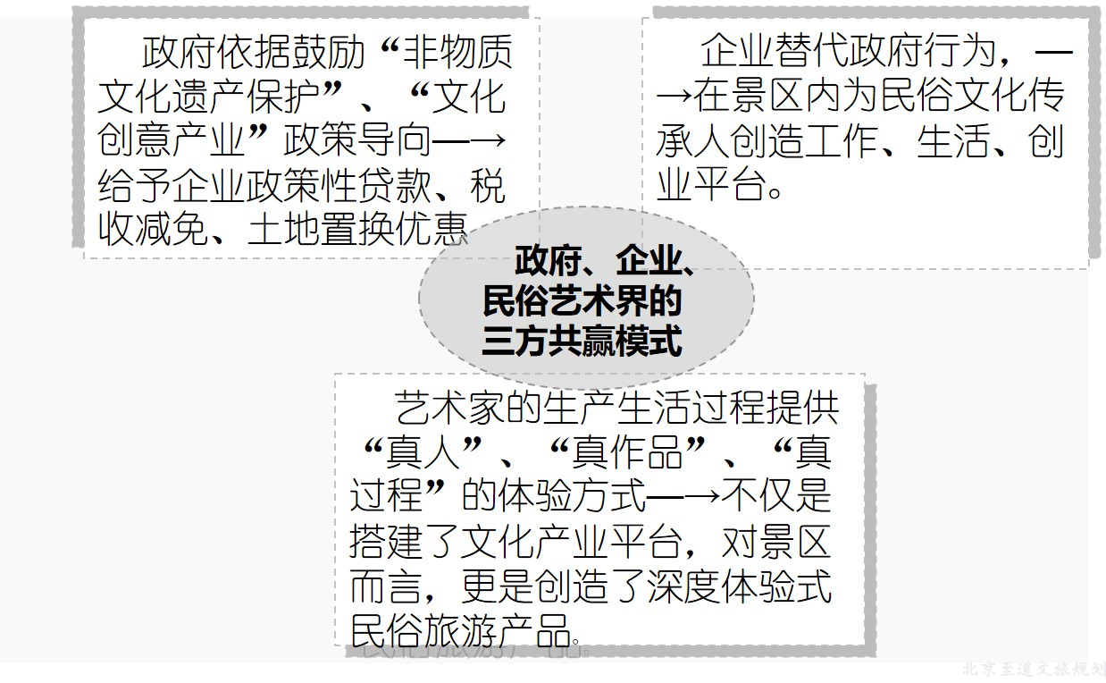 政府依據(jù)鼓勵文化創(chuàng)意產業(yè)政策導向,給予企業(yè)政策性貸款、稅收減免、土地置換等優(yōu)惠;企業(yè)替代政府文化事業(yè)行為,在景區(qū)內給民俗文化藝術家們創(chuàng)設工作、生活、創(chuàng)業(yè)平臺;而藝術家在園區(qū)中生產生活一體化形態(tài),則形成“真人”、“真作品”、“真過程”的“三真式”深度體驗旅游方式。