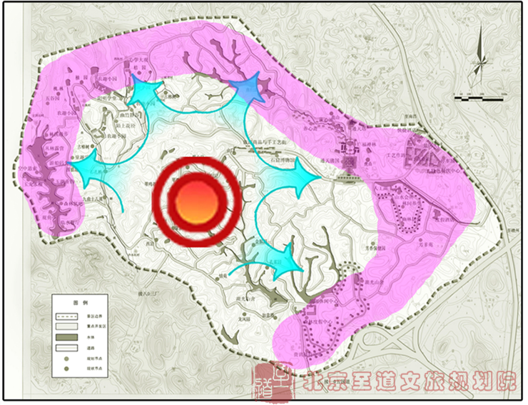 1、景區(qū)生長(zhǎng)結(jié)構(gòu):依托核心,多向發(fā)散,外圍為重,中心提升