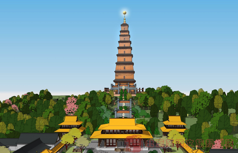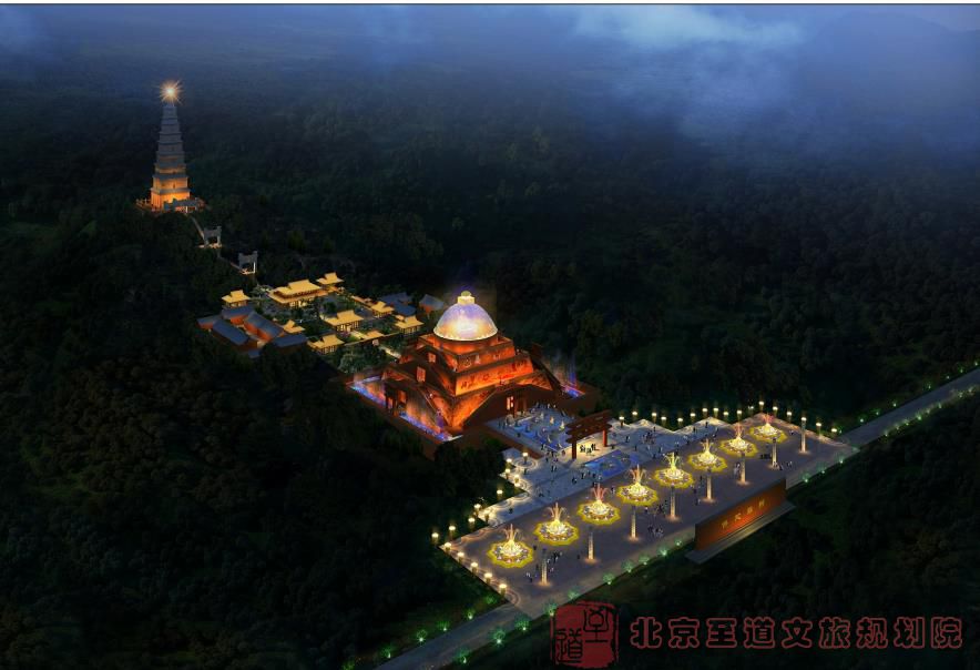 為了與通天佛國(guó)在宗教功能以及景觀需求上相呼應(yīng),在通天寺北側(cè)山頂上興建一座大型佛塔——通天塔。通天塔將是景區(qū)內(nèi)重要的景觀節(jié)點(diǎn)和文化節(jié)點(diǎn),同時(shí)也是景區(qū)新的制高點(diǎn),具有景觀地標(biāo)的功能。