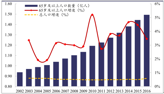 2016 年我國(guó)65 歲以上人口已達(dá)到 1.49 億人, 65 歲以上人群占總?cè)丝诒壤秊?10.8%。(按照學(xué)術(shù)標(biāo)準(zhǔn),當(dāng)一個(gè)國(guó)家或地區(qū)60歲以上老年人口占人口總數(shù)的10%,或65歲以上老年人口占人口總數(shù)的7%,即意味著這個(gè)國(guó)家或地區(qū)的人口處于老齡化社會(huì)。中國(guó)老年人口比例嚴(yán)重超標(biāo)。)