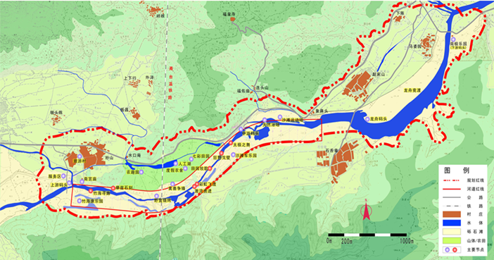 (上左圖是漂流上碼頭對面的大片沙灘地,地處白溪南岸、石浦山北麓。規(guī)劃此處為竹主題康樂園,大面積的種植淡竹,借以阻擋游客視線,使竹林林冠線與山相接,美化景觀)