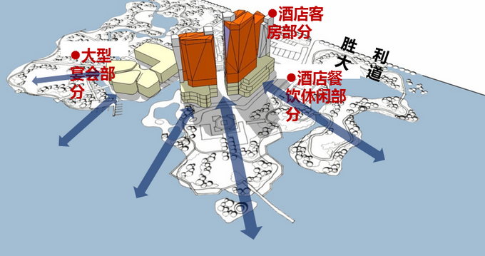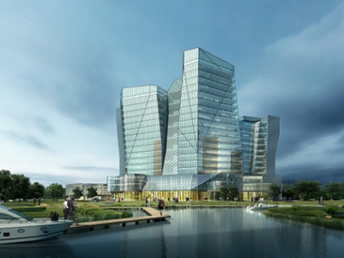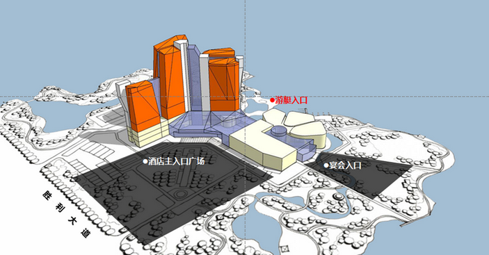 總體定位于五星酒店、湖濱商業(yè)旅游地產(chǎn)新地標(biāo)。形象口號(hào)是湖畔的璀璨晶體,核心思路是湖畔新地標(biāo)——綻放天際線;主體突出,集中布局的客房塔樓;化整為零,客房景觀與朝向優(yōu)化;空間重塑,景觀視覺(jué)廊道的形成。