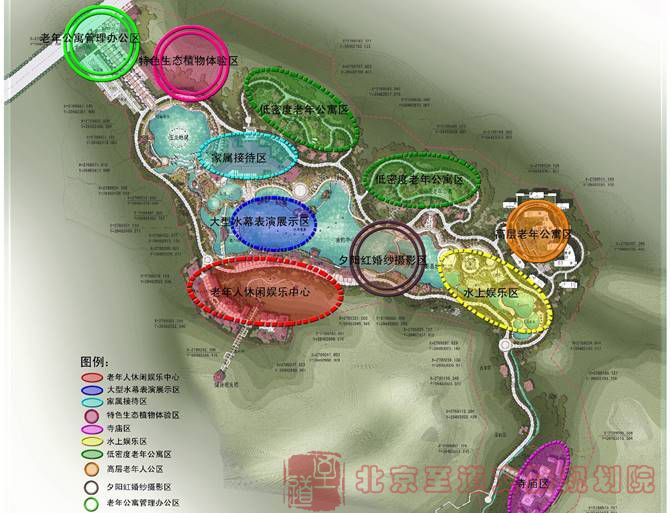 九大區(qū)域?yàn)椋豪夏旯^(qū)(高層及低密度)、老年公寓管理辦公區(qū)、家屬接待區(qū)、大型水幕表演展示區(qū)、老年人休閑娛樂區(qū)、夕陽紅婚紗攝影區(qū)、水上娛樂區(qū)、特色生態(tài)植物體驗(yàn)區(qū)、寺廟區(qū)。