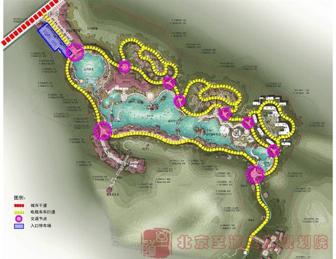用地東北側(cè)規(guī)劃道路是唯一的臨街面,設(shè)計(jì)主入口,并布置了一大型停車場,供小車及大型旅游大巴??浚扇肟谔幗哟行陌才烹娖寇囁椭料鄳?yīng)的節(jié)點(diǎn),避免交通混雜,保證區(qū)內(nèi)的交通安全,并提高基地的生活休閑品質(zhì)。