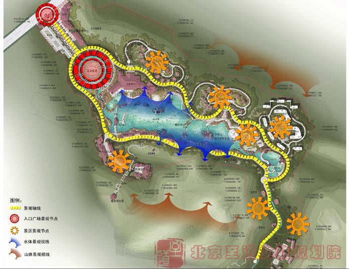 入口區(qū)直至山谷深處一條東西向景觀主軸將是用地內(nèi)的重點(diǎn)打造的景觀視覺通廊,同時主軸也貫穿和銜接了用地內(nèi)的各個節(jié)點(diǎn)片區(qū),讓人們享受休閑產(chǎn)品多樣的同時也享受到陽光和山水的美景。
