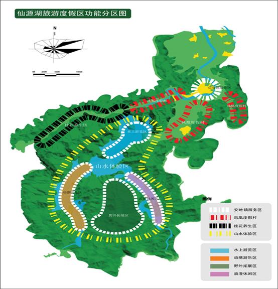 遵照上述功能結構原則,仙源湖旅游度假區(qū)分為安地鎮(zhèn)服務區(qū)、鳳凰度假村、桂花養(yǎng)生區(qū)、山水體驗區(qū)四大區(qū)域。