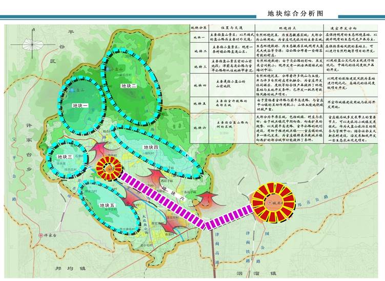 整個盤山休閑度假區(qū)基本布局在遵循片區(qū)地形地貌和相關(guān)產(chǎn)業(yè)已有格局的基礎(chǔ)上,以地塊開發(fā)條件分析為依據(jù),將官莊“大盤山”區(qū)域內(nèi)旅游產(chǎn)業(yè)發(fā)展格局確定為“雙心、兩帶、一區(qū)”的基本形態(tài)。