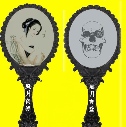 賈瑞拿了“風(fēng)月寶鑒”后,先照背面,只見一個骷髏立在里面,嚇得賈瑞連忙掩了罵:“道士混帳,如何嚇我!----我倒再照照正面是什么?”于是又將正面一照,只見鳳姐站在里面招手叫他。賈瑞心中一喜蕩悠悠的覺得進了鏡子,與鳳姐云雨一番。一睜眼,鏡子從手里掉過來,仍是反面立著一個骷髏。反復(fù)多次,最后,剛要拿出鏡子來,只見黑白無常兩個人走來鐵鎖把他套住,一命嗚呼。