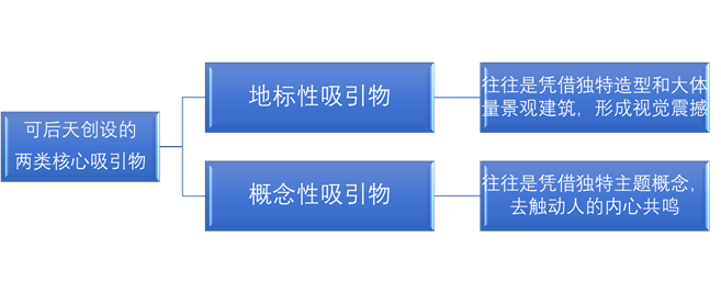但基礎(chǔ)規(guī)律如下:(1)地標(biāo)性吸引物要以足夠建設(shè)用地支持、足夠資金支持為前提;(2)概念性吸引物的打造,往往隱藏在當(dāng)?shù)匚拿}地脈中,但需要很高的策劃智慧去提煉出來(lái)。