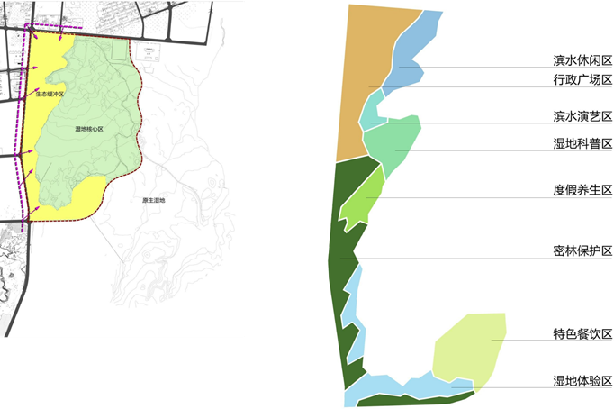 通過對(duì)周邊功能、用地性質(zhì)和交通的分析。得到結(jié)論是是:城市無(wú)序發(fā)展已經(jīng)導(dǎo)致濕地退化。當(dāng)下應(yīng)重點(diǎn)建設(shè)城市邊界的生態(tài)緩沖帶; 集中資源打造景觀亮點(diǎn);以最少的投入獲取最大的效益。