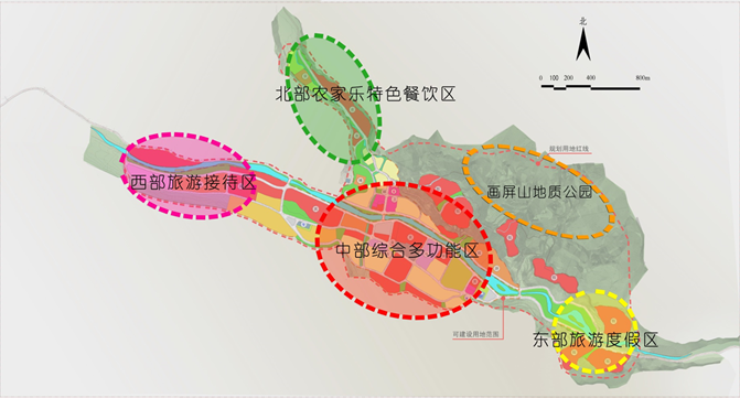 五分區(qū)——東部旅游度假區(qū)、西部旅游接待區(qū)、北部農(nóng)家樂特色餐飲區(qū)、中部中心綜合多功能區(qū)以及畫屏山地質(zhì)公園