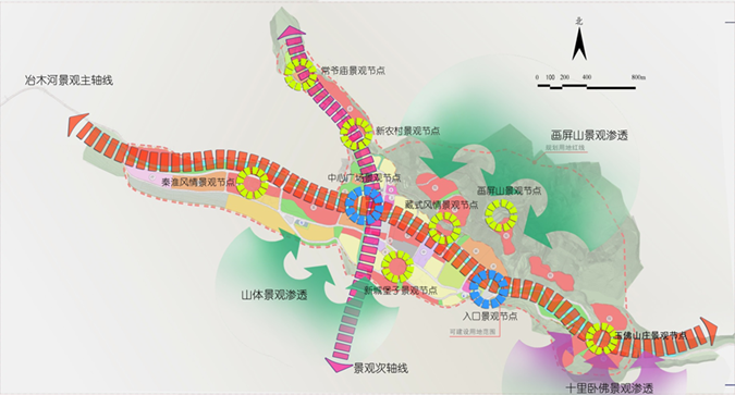 九大節(jié)點(diǎn):秦淮風(fēng)情景觀節(jié)點(diǎn)、中心廣場景觀節(jié)點(diǎn)、新城堡子景觀節(jié)點(diǎn)、入口景觀節(jié)點(diǎn)、玉佛山莊景觀節(jié)點(diǎn)、畫屏山景觀節(jié)點(diǎn)、新農(nóng)村景觀節(jié)點(diǎn),常爺廟景觀節(jié)點(diǎn)、藏式風(fēng)情景觀節(jié)點(diǎn)。