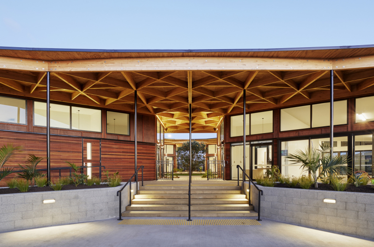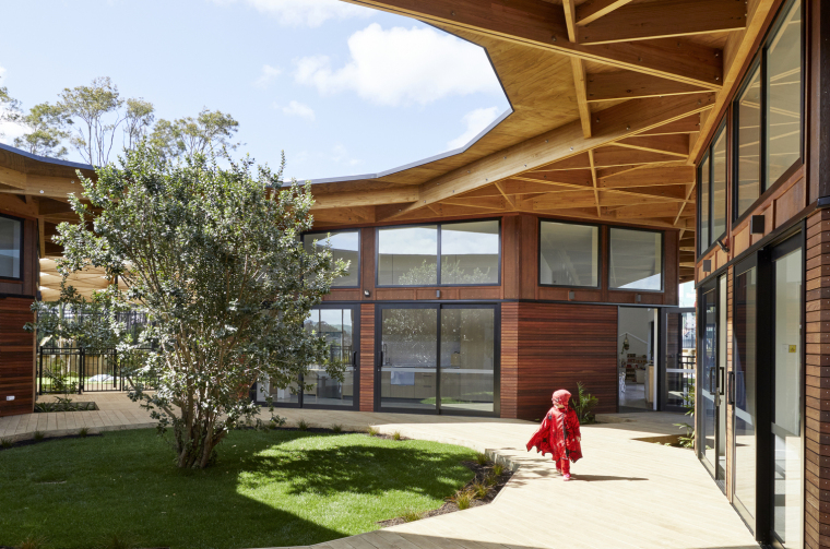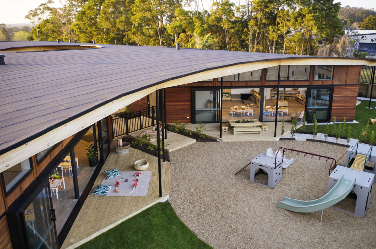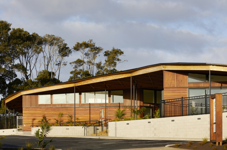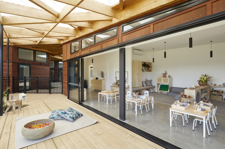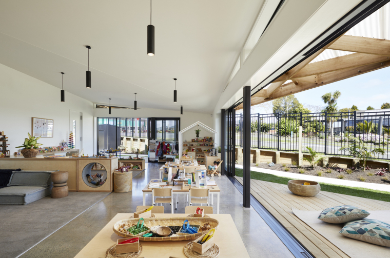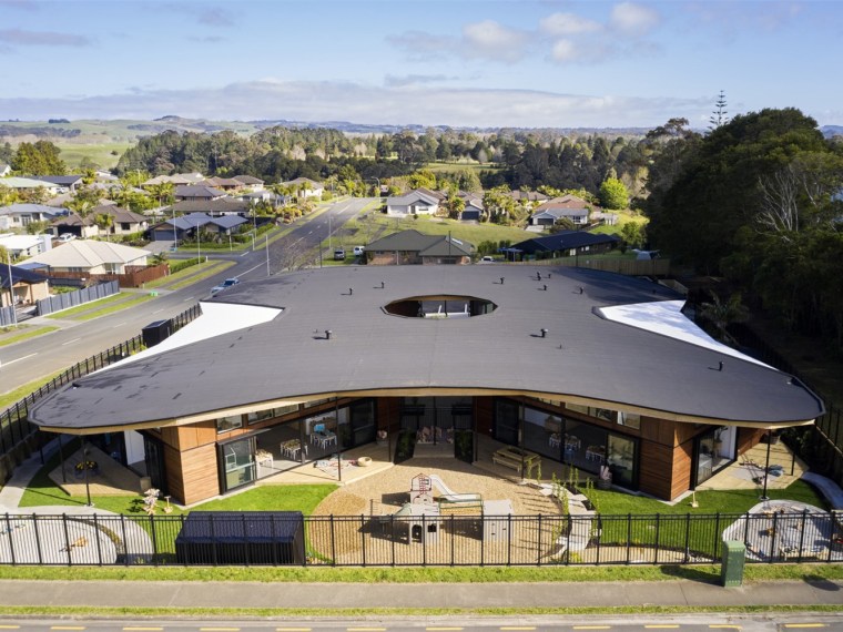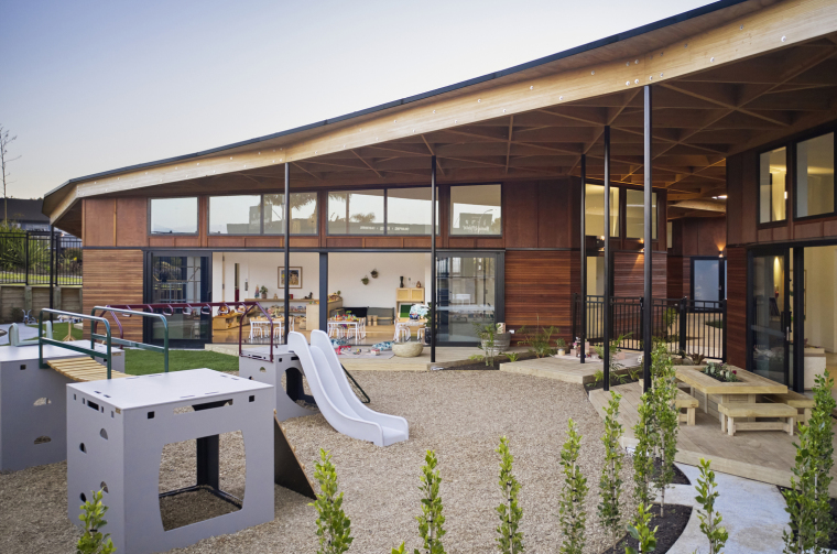 鑒于Kerikeri的宜人氣候,我們希望該中心能夠反映環(huán)境,并讓兒童以更自然的方式與之互動。因此,該建筑分為四個展館,占地700平方米,每個展館容納不同年齡段的兒童,并由大型高聳的屋頂遮蓋,將展館綁在一起并允許在這些地下室之間移動,但不封閉。屋頂遮蓋了涼亭及其周圍的大部分空間,免受日曬雨淋,提供了全天候空間,例如戶外用餐和外部流通,整個設計中都點綴著袖珍花園。豆莢經(jīng)過精心設計,使其面向位于專用中心中心的驚人的pohutakawa樹,以鼓勵兒童與自然環(huán)境建立聯(lián)系。雖然建筑設計反映了許多島嶼灣家庭的當?shù)匚幕?,但室?nèi)之間界限的模糊激發(fā)了整個中心的開放式探索和自我發(fā)現(xiàn)。該項目采用了更自然的材料調(diào)色板,為兒童創(chuàng)造了一個溫馨宜人的空間。水平的木材立面采用鋁細木工的樣式,以創(chuàng)造一個更輕便,更自然的環(huán)境。展館設有大型推拉門,可最大程度地連接室外游樂場,并提供充足的日光和自然通風,以確保保持最佳的內(nèi)部環(huán)境質(zhì)量,使年輕人的身心健康。在內(nèi)部,每個教室都是由New Shoots團隊專門設計的,旨在為孩子們提供獨特的學習環(huán)境,其功能可以滿足每個年齡段的獨特需求。實施了定制設計的櫥柜和家具,以確保對每個空間都進行了周密的考慮,從建筑物的整體建筑形式中營造出一種凝聚力。宜人的室外區(qū)域充分利用了北部冬季無冬的氣候,為塔馬里基(tamariki)提供了自然靈感的游樂設施。